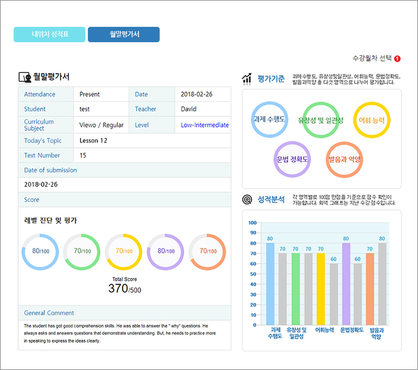 레벨평가의 결과를 근거로 교재나 수업 수준을 변경할 수 있습니다.