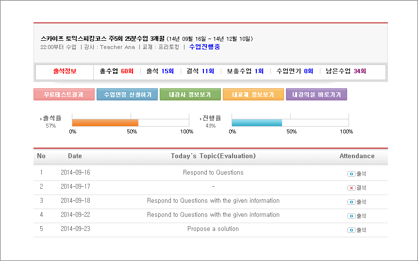 출석표에서는 강의평가서, 강사정보, 출/결석에 대한 데이터, 출석률, 수업진행률을 확인하실 수 있습니다.