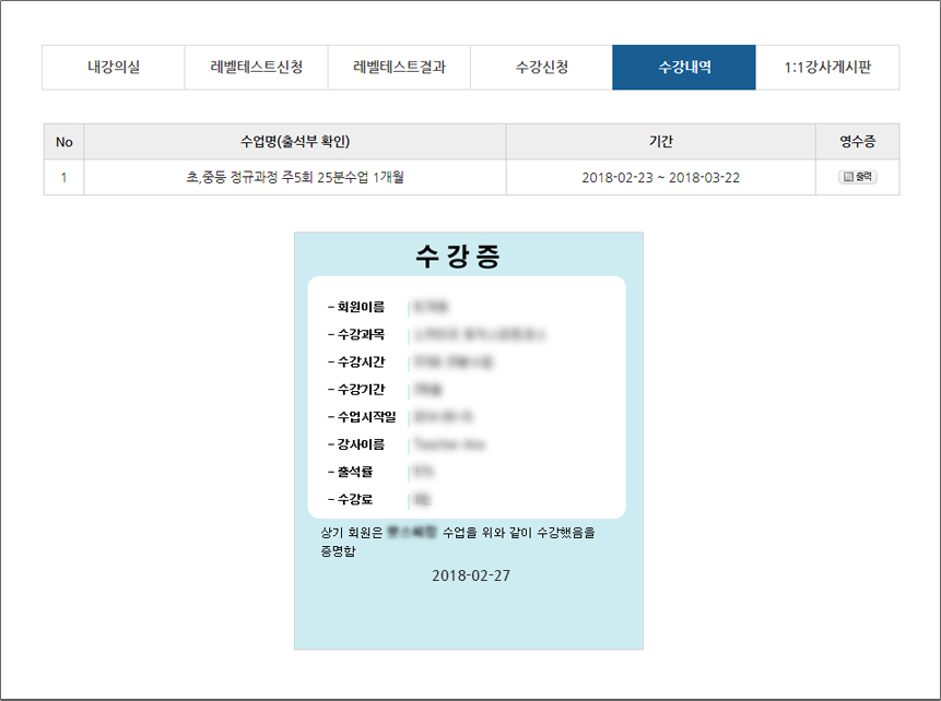 수강내역 및 영수증 출력서비스